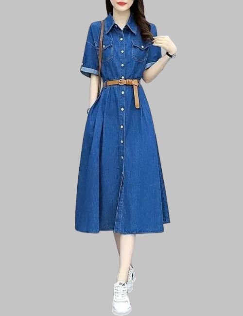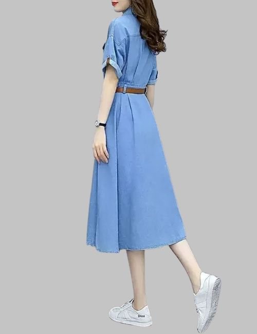 This Denim Midi Dress fits well into your day. You can wear it to work with a plain coat. Go out for coffee with flat shoes or dress it up for night food with high shoes & a big bag. The thin fabric dries fast. This makes it good for trips. The one shade makes it easy to match with small add-ons. From job to fun on days off, this dress keeps you sharp with no more work.