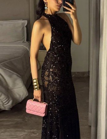 This glamorous backless dress blends shimmering sequins with a bold backless silhouette for a confident, elegant look.