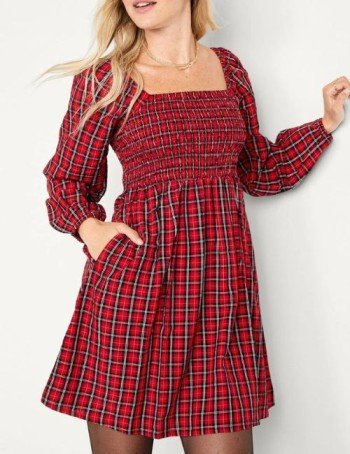 Timeless plaid designs add warmth and charm, making this dress a holiday favorite.