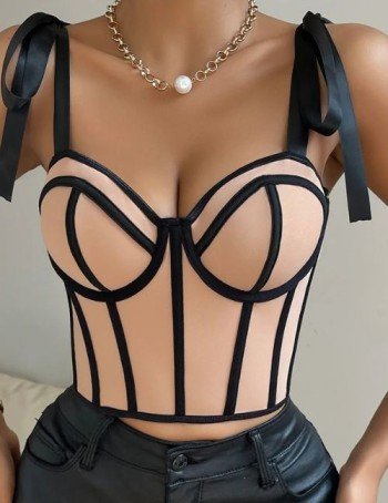 A ribbon strap corset crop top features structured corset detailing with adjustable ribbon straps, offering both support and style.