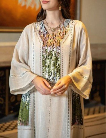 Subtle sparkle meets refined design, making this kaftan a standout piece for special occasions.