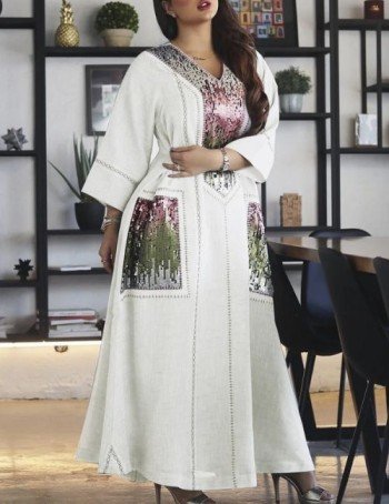 The V neck design adds a contemporary edge, enhancing the neckline while maintaining the modest elegance kaftans are loved for.