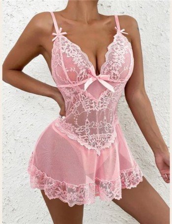 A sheer mesh lace night dress is crafted using transparent mesh fabric combined with intricate lace details to create a soft, elegant appearance.
