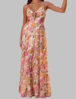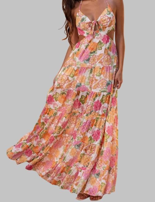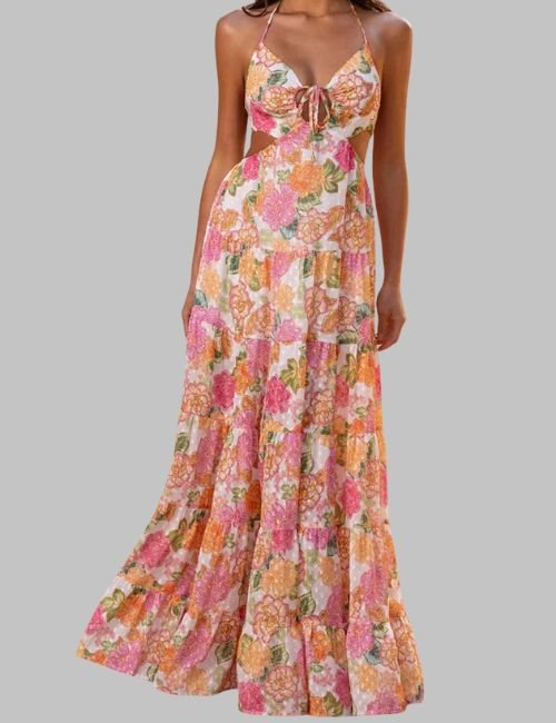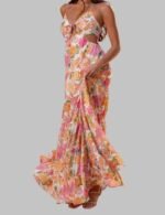 This Sleeveless Maxi Dress turns heads with its carefully designed ruffle layers and flowing hem that create movement with every step. Side cuts give a cool style and let you walk with ease. The bright floral print & neat shape make you look sharp & sure from all sides.