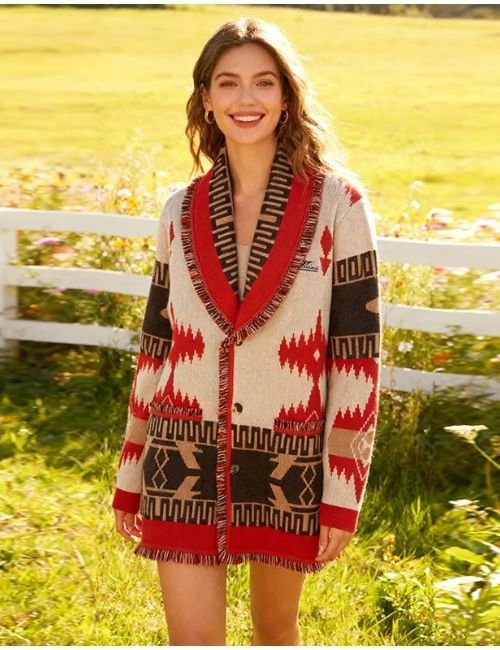 Women’s cardigan sweater, Tassel Patchwork Sweater, V Neck Cardigan Sweater, knitted geometric pattern cardigan sweater