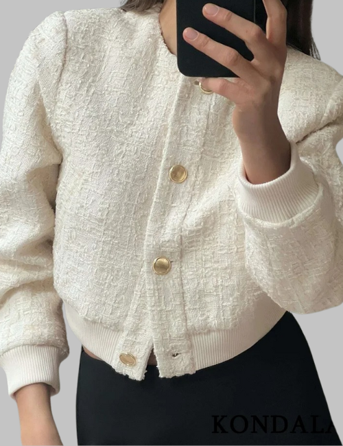 Button-up closure provides adjustable front for easy wear. Pockets are not specified but bomber styles often include them. The design focuses on clean lines and textured elegance.